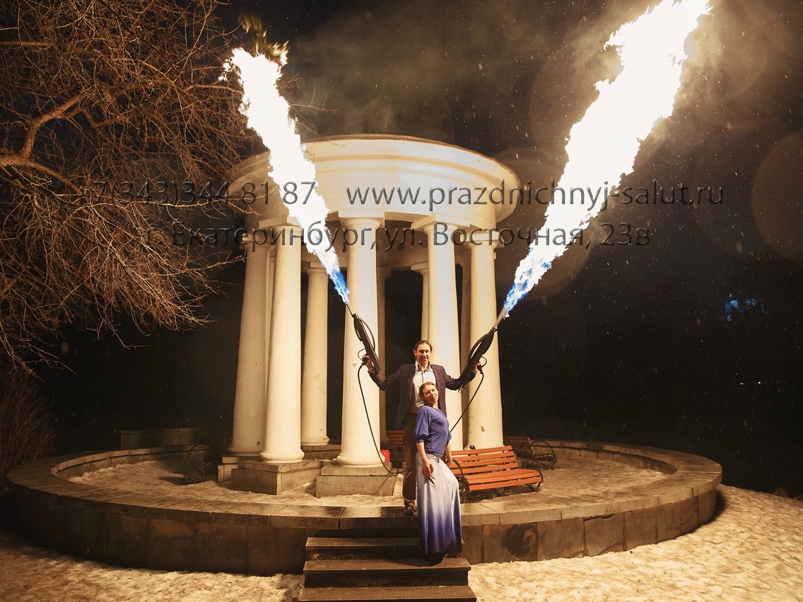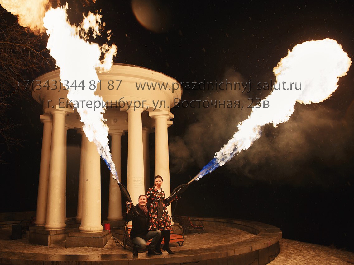 Огнемет на свадьбу - основным направлением для применения огнемета, являются огненное и фаер шоу, а также различные захватывающие с ним демонстрации. Проведенные свадебные фейерверки показали, чем больше огня на площадке, тем зрелищнее получается фейерверк. Огнемет можно заказать в дополнение к: Огненному сердцу, Огненным буквам, цифрам или логотипу или Фаер шоу. После программы невеста и жених, а также гости могут сфотографироваться с огнеметом.