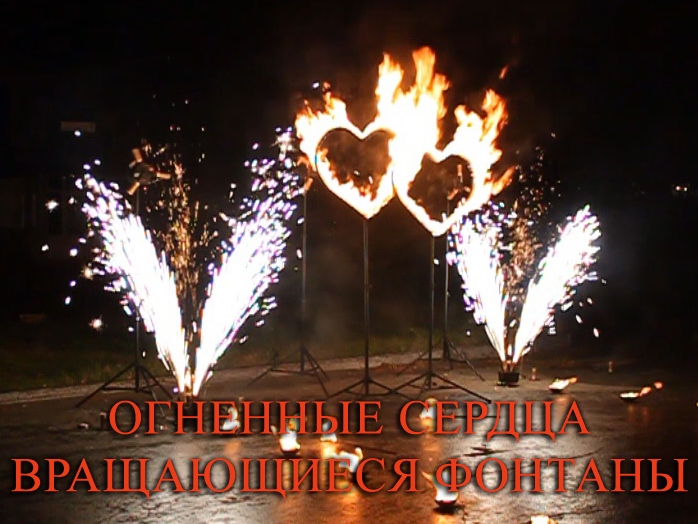 Дополнительно в огненным сердцам можете заказать, музыкальное сопровождение, пиротехнические фонтаны и разнообразные фигуры из них, огнепады и Праздничный Салют от 9 000 руб.