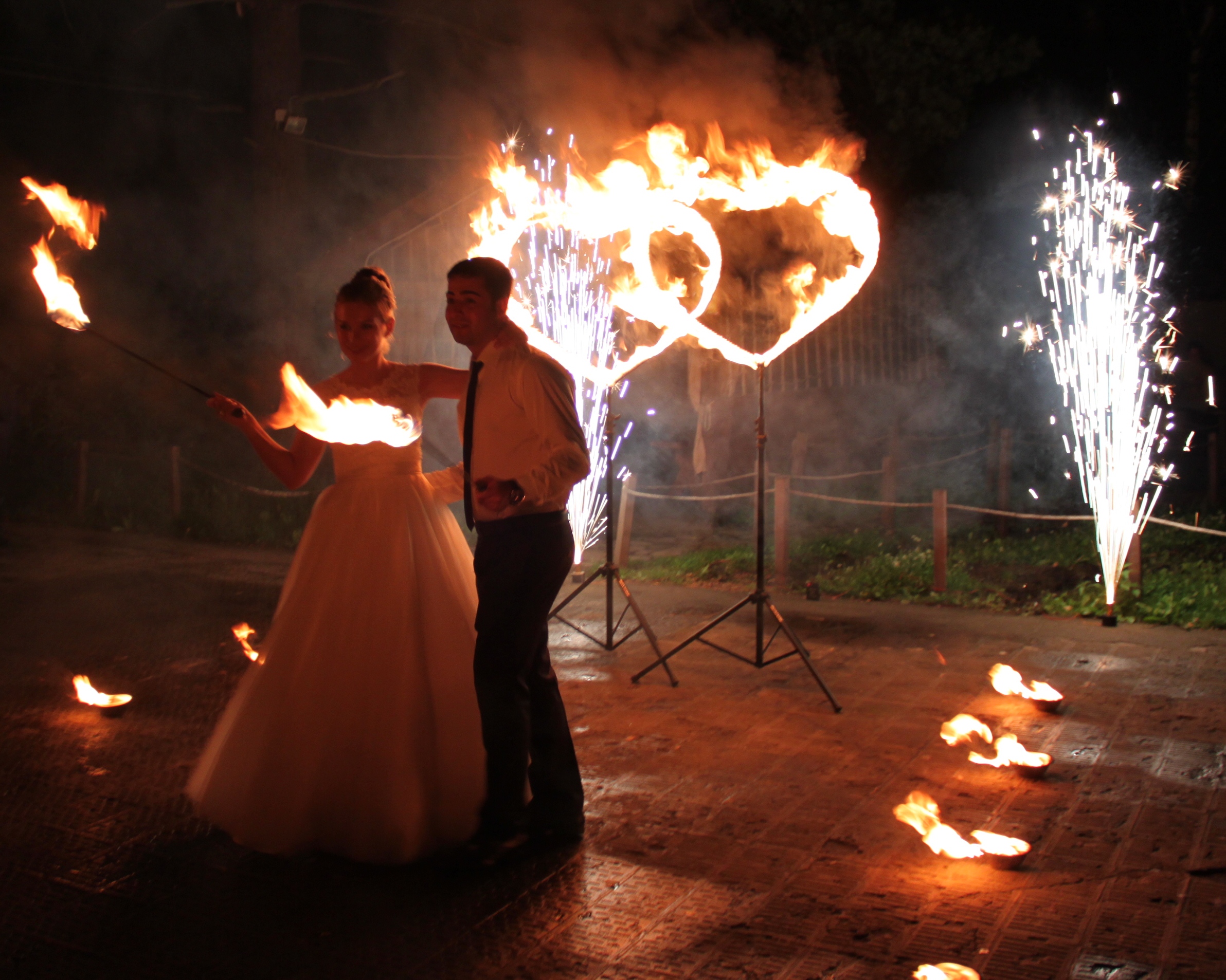 Огненные сердца 2шт., Чаши с огнем 10 шт.(дорожка), огненные факела 2 шт., вращающиеся фонтаны 2 шт., вертушка с 3-фонтанами, музыкальное сопровождение.