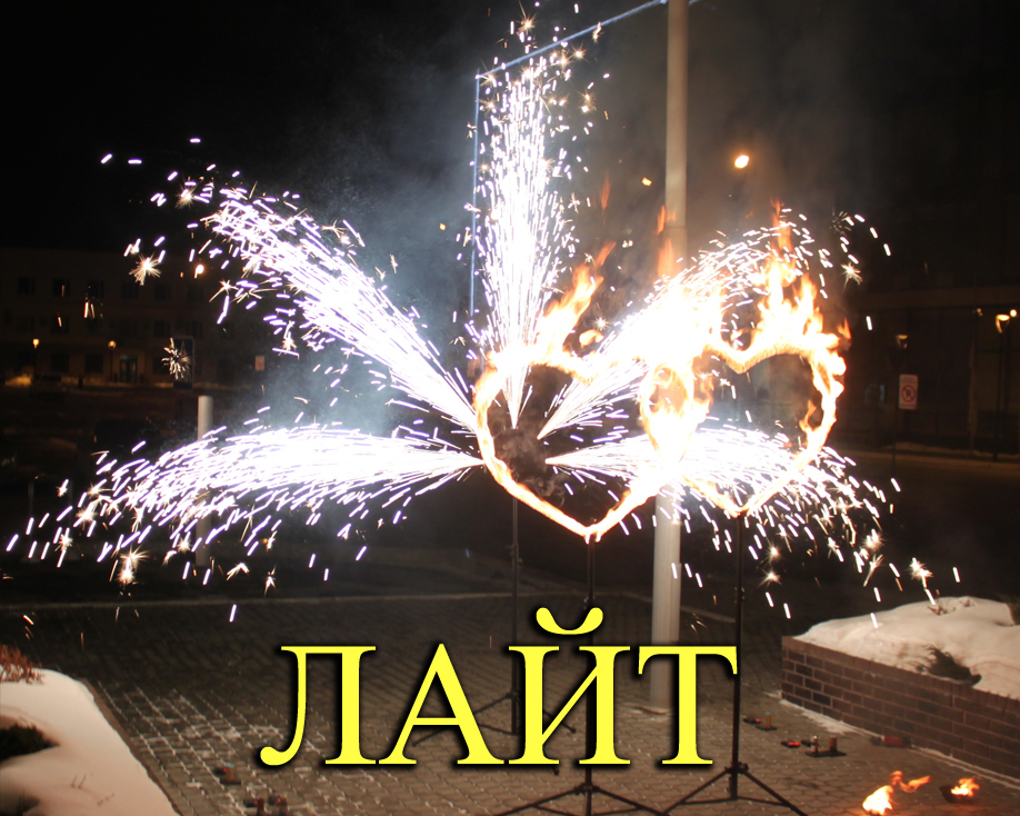 Огненные сердца 2шт., Чаши с огнем 10 шт., пиротехнические фонтаны 2 шт., пиротехническая фигура пятилистник, музыкальное сопровождение.