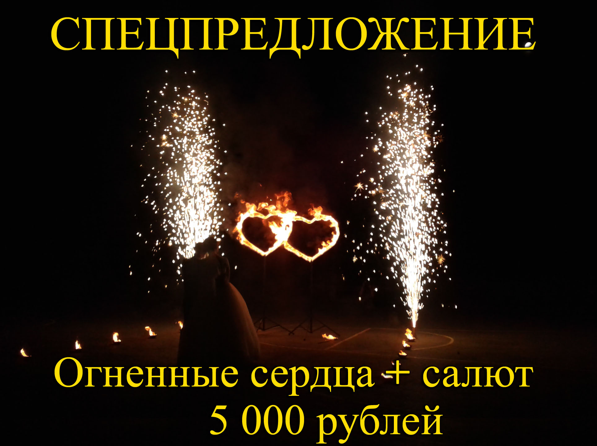 2 огненных сердца + 2 фонтана + огненная дорожка + 2 факела + работа пиротехника + музыка + салют 50 залпов = 7500 руб.