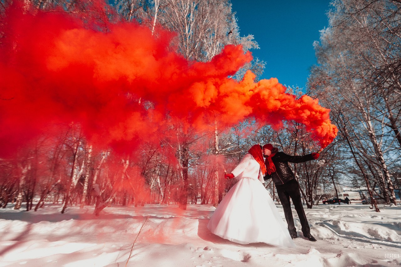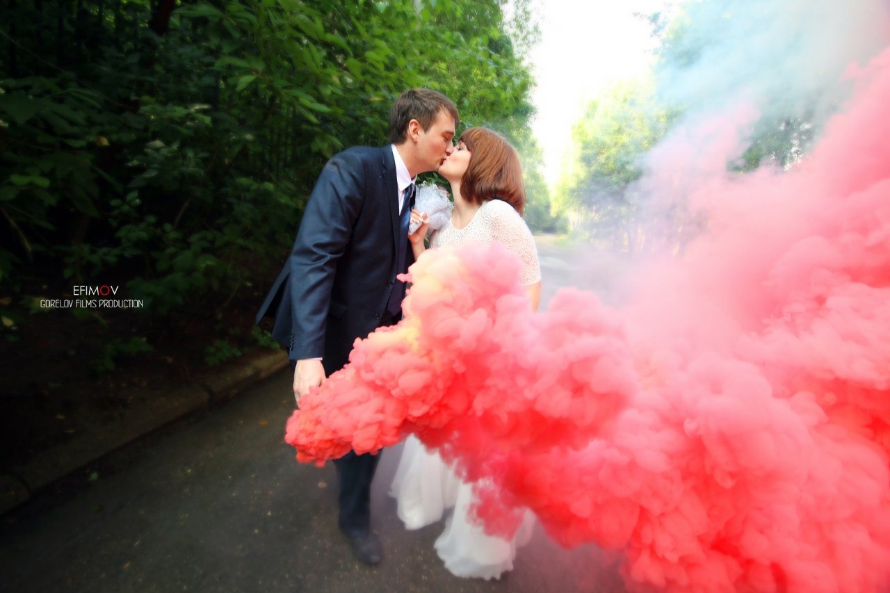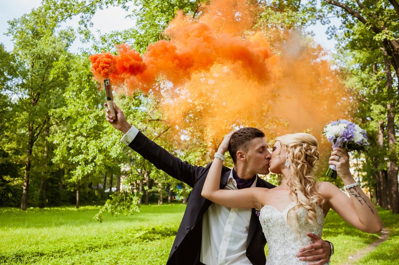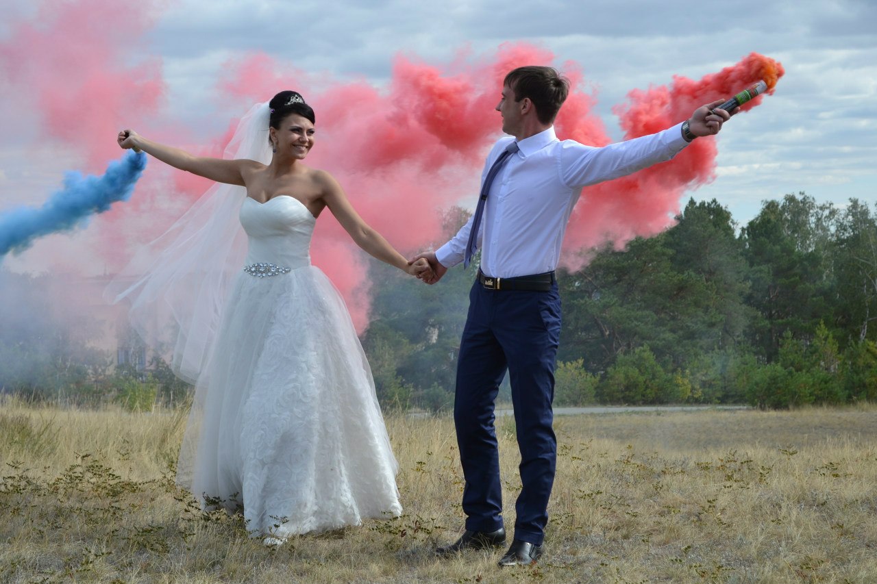Благодаря цветным дымам, можно создать замечательные фотографии для свадебной фотосессии, так сказать добавить красок к вашим эмоциям.